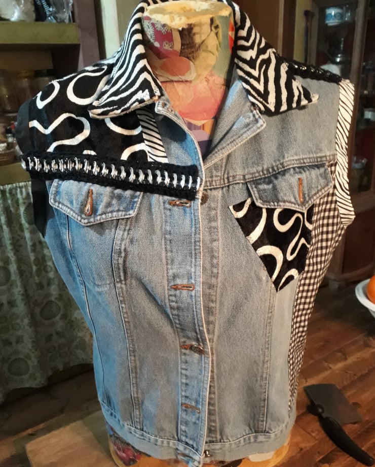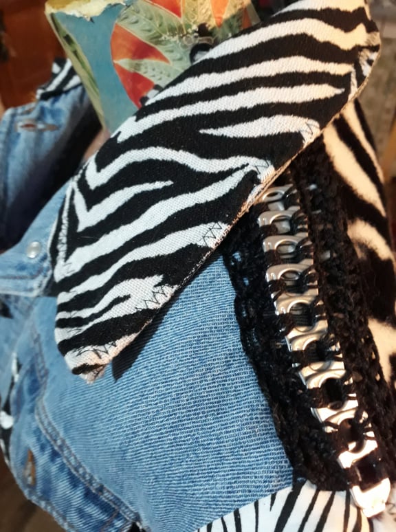 Chaleko vaquero con tela de cebra y cuadritos en blanco y negro; adornos de anillas de lata con crochet, gato anarquista pintado a mano. 43 cm de hombro y 106cm contorno de pecho.