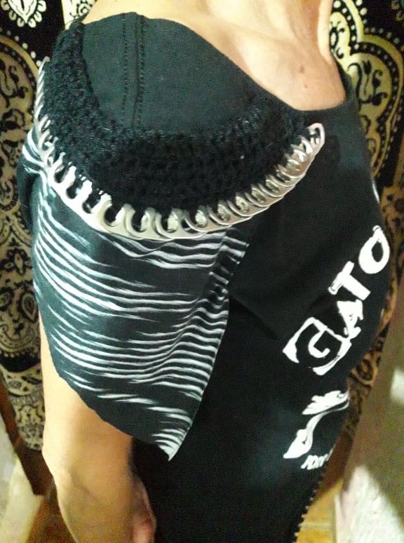 Camivesti Gato Calavera, con adornos de anillas de lata y ganchillo en hombro.