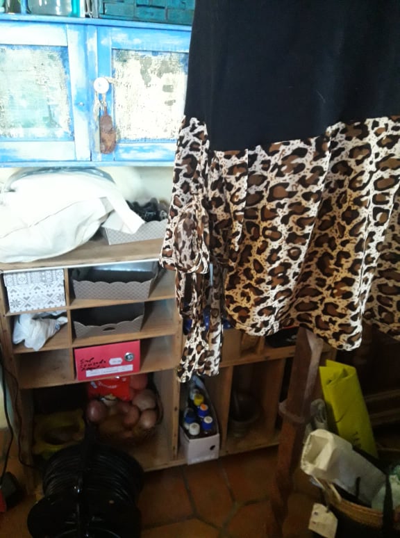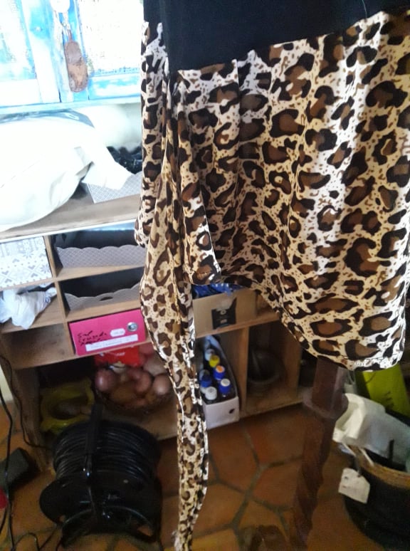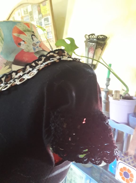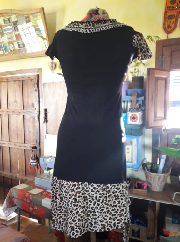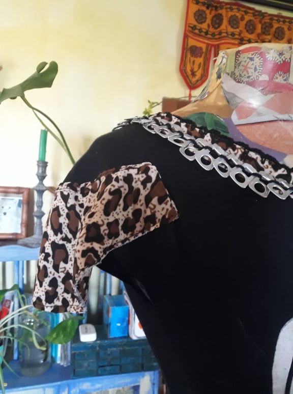 Camivesti La Ratonera con doble cadena de anillas de lata con ganchillo en cuello, combinado con leopardo en hombro, falda y cuello.