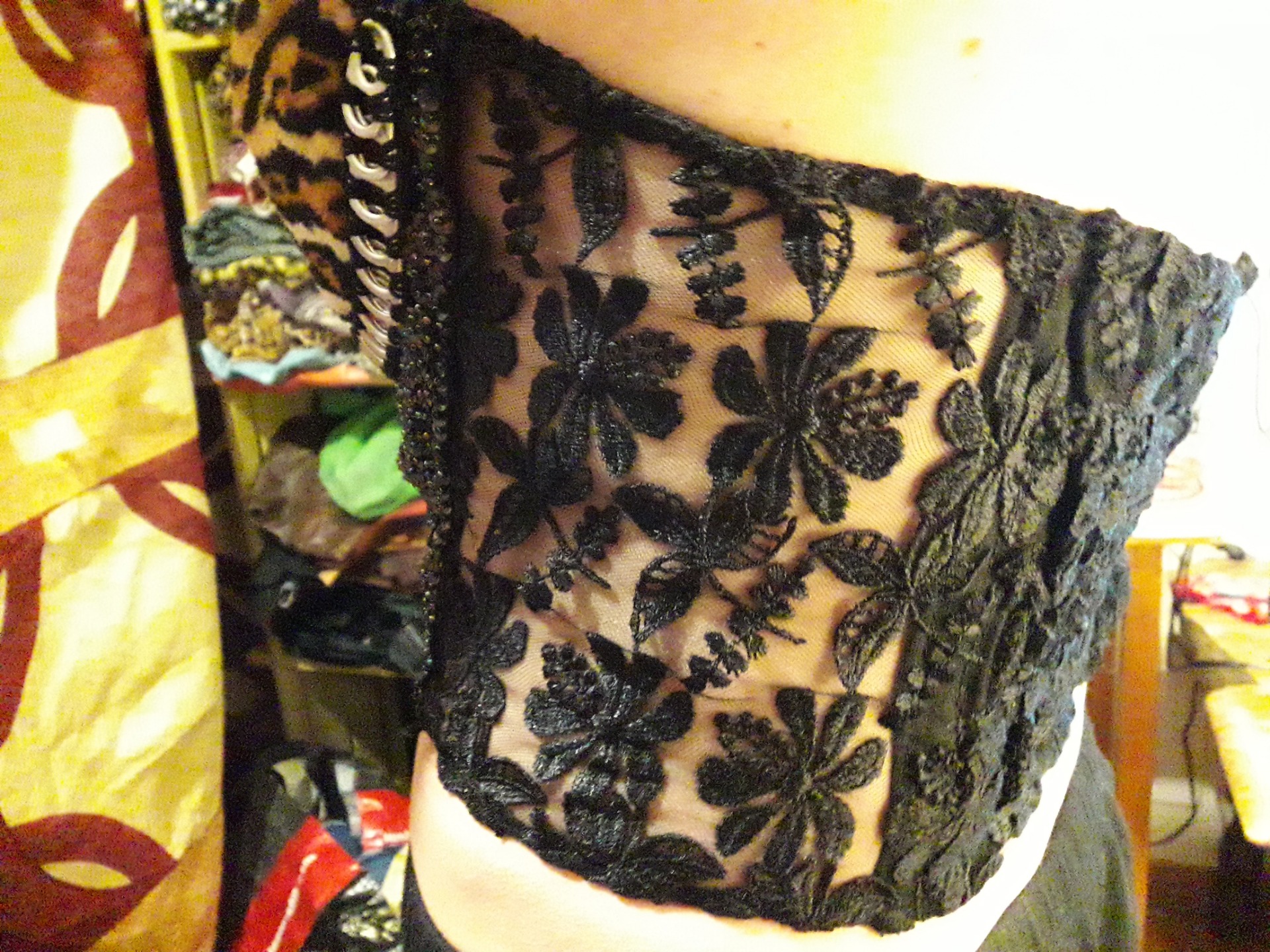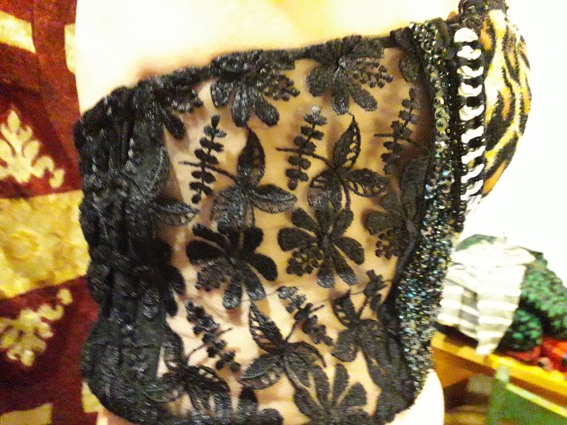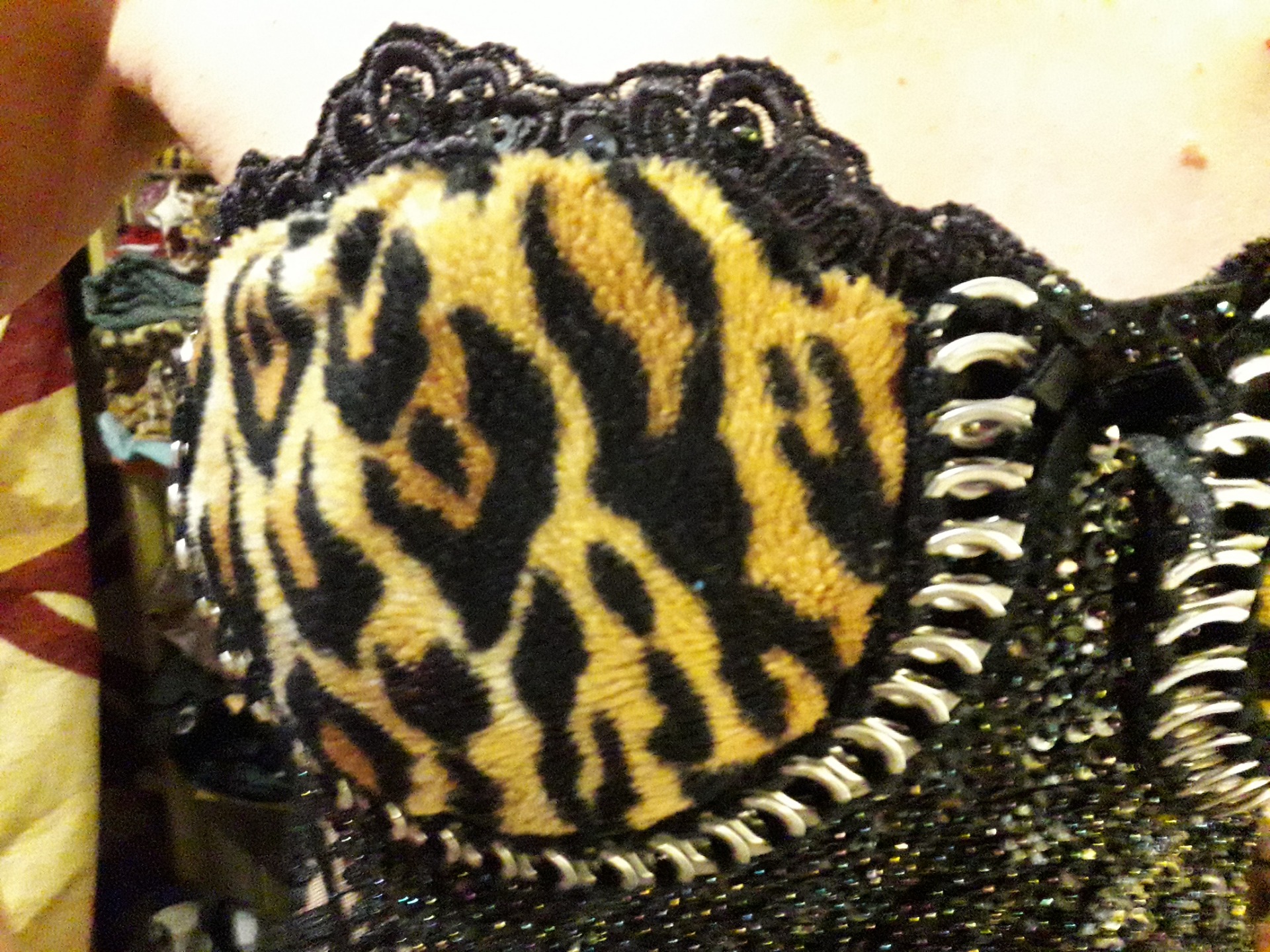 Korpiño con tela de leopardo, lentejuelas y anillas de lata. Talla L.